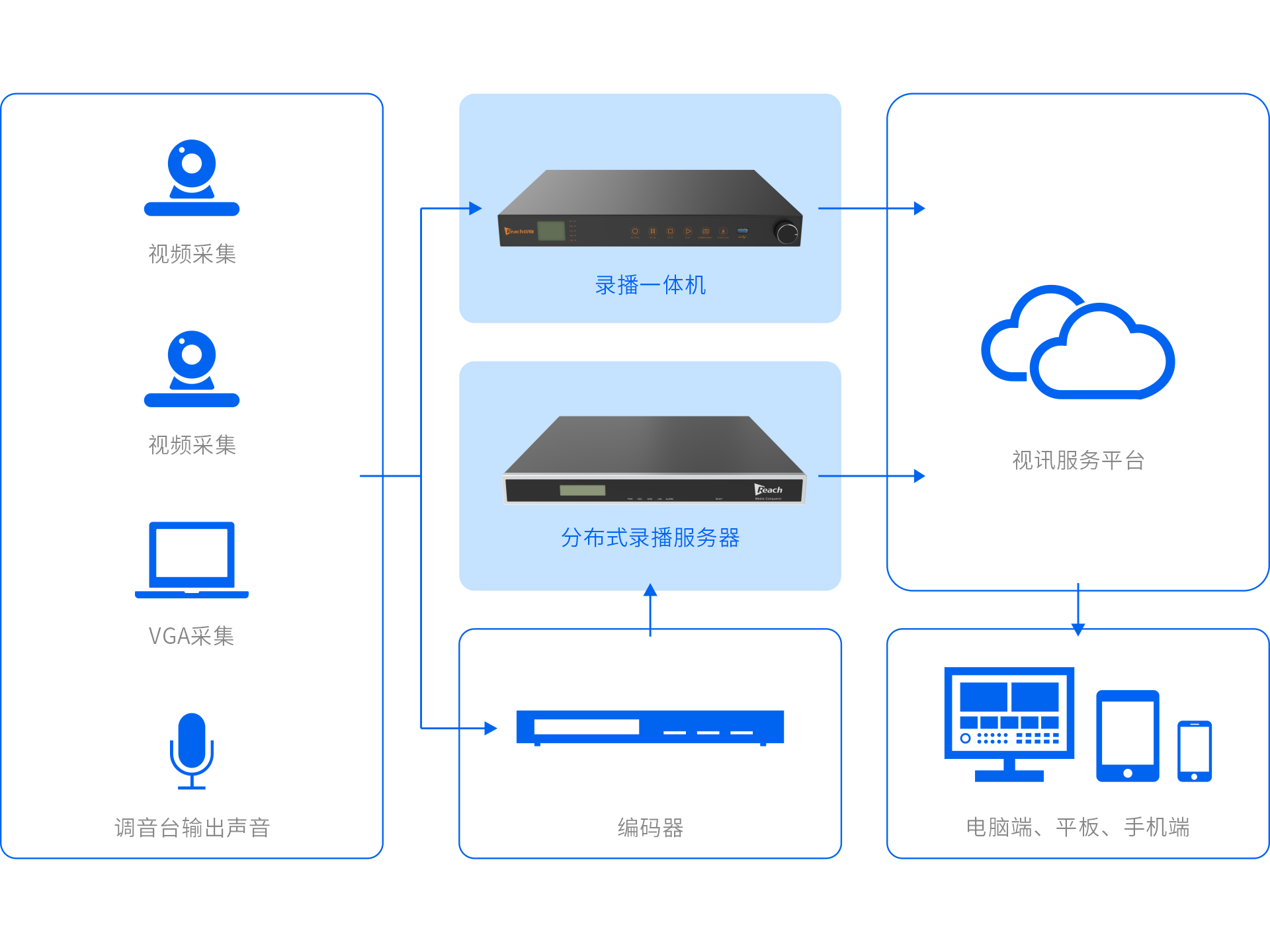 本地會議應(yīng)?主要解決??本地會議場景的記錄和分享需求,如報告演講、培訓(xùn)、會晤會談等場景。針對單個會議室需求,銳取提供錄播?體機?案進?匹配,針對同時有多間會議室需求的銳取提供分布式錄播?案進?匹配。錄播?體機和分布式錄播服務(wù)器均?持與銳取視訊服務(wù)平臺對接,?持直播點播發(fā)布,?持視頻資源的?動上傳,統(tǒng)?管理。